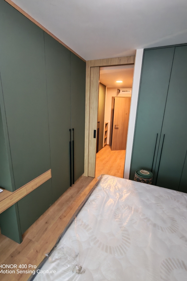 Представяме малък и уютен апартамен , чиято жилищна площ трябваше да бъде разделена на отделни помещени с цел оптимизиране на жилищното пространство . Чрез изграждане на преградна стена от сдвоено ПДЧ EGGER в дървесен декор се обособи и спалня , с която апартамента не разполагаше. Витринiте с вградено LED осветелние са ефектен начин да се разшири отпически общото пространство. Същевремнно създават уют и осигурява място за съхранение на красивите вещи на клиента.