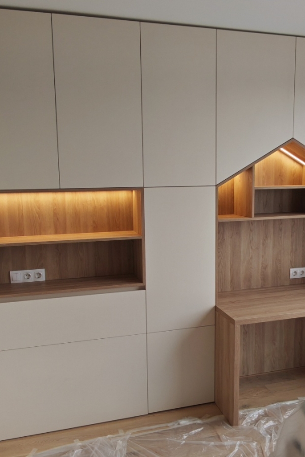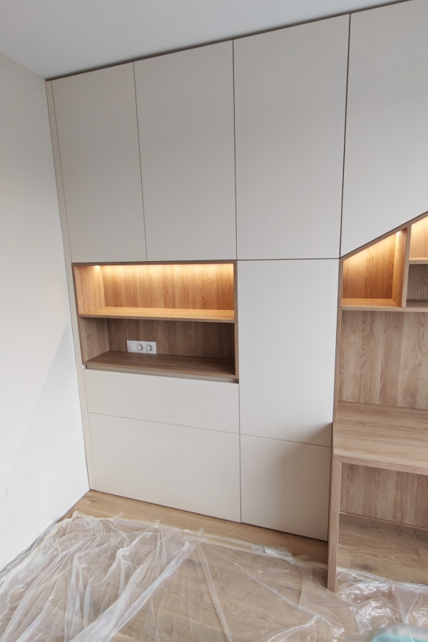 Секцията разполага с практични вградени шкафове, които осигуряват достатъчно място за съхранение на дрехи, книги и играчки, като същевременно поддържат стаята подредена и организирана. Отворените ниши с вградено LED осветление добавят модерен акцент и са идеални за декорации или любими вещи на детето. За стабилното и съобразено с всички изисквания за безопасност, конструиране на корпусната мебел са използвани ПДЧ дървесен и едноцветен декор.