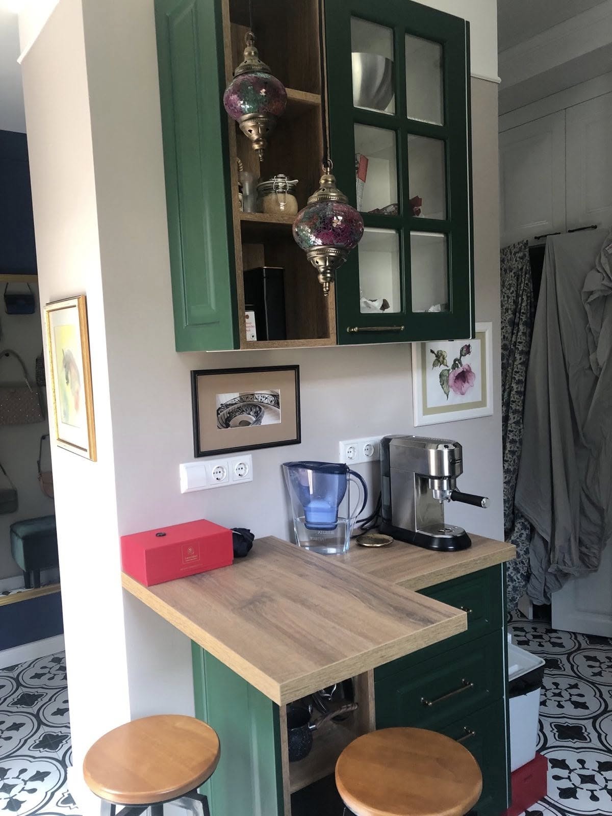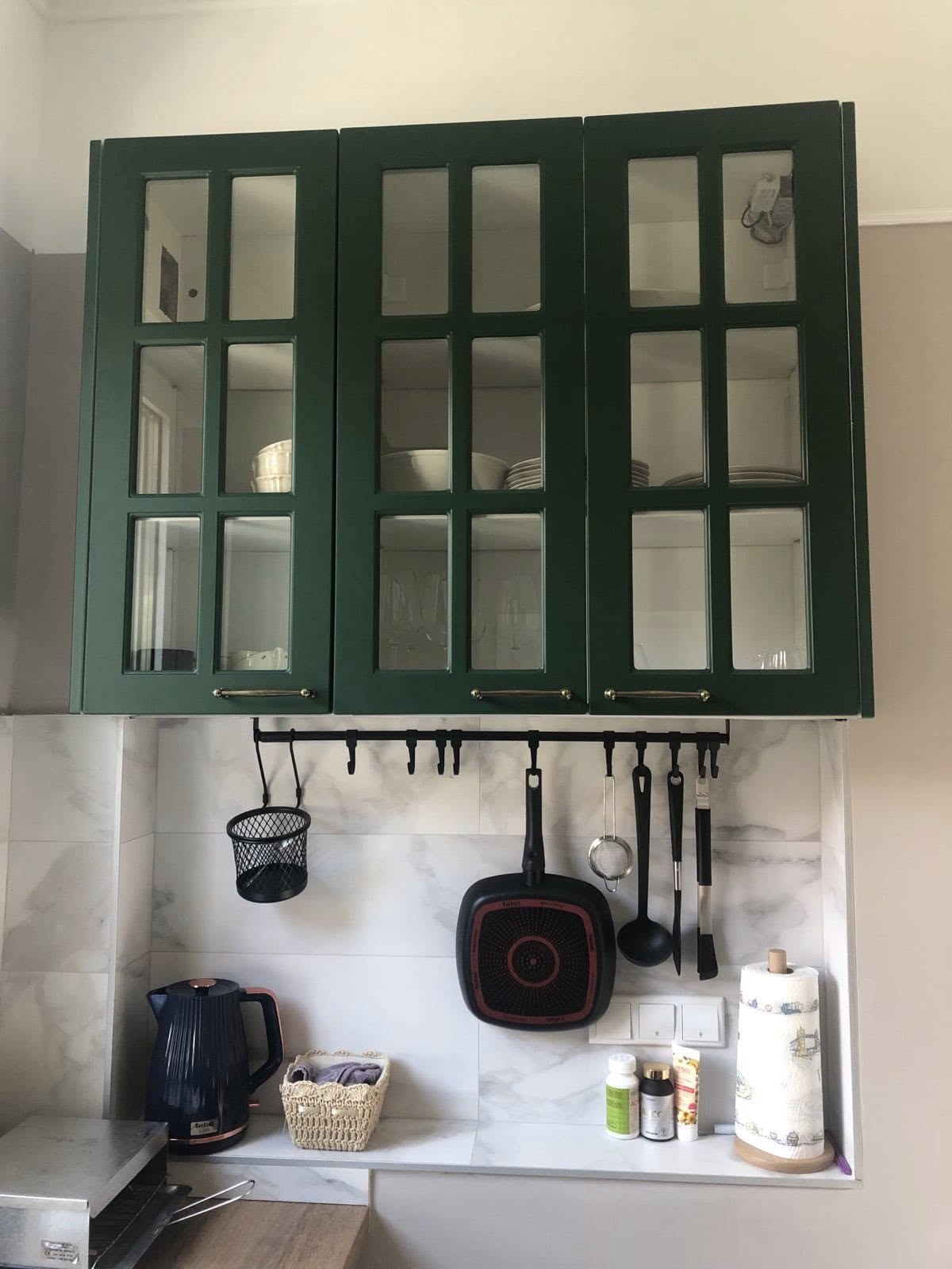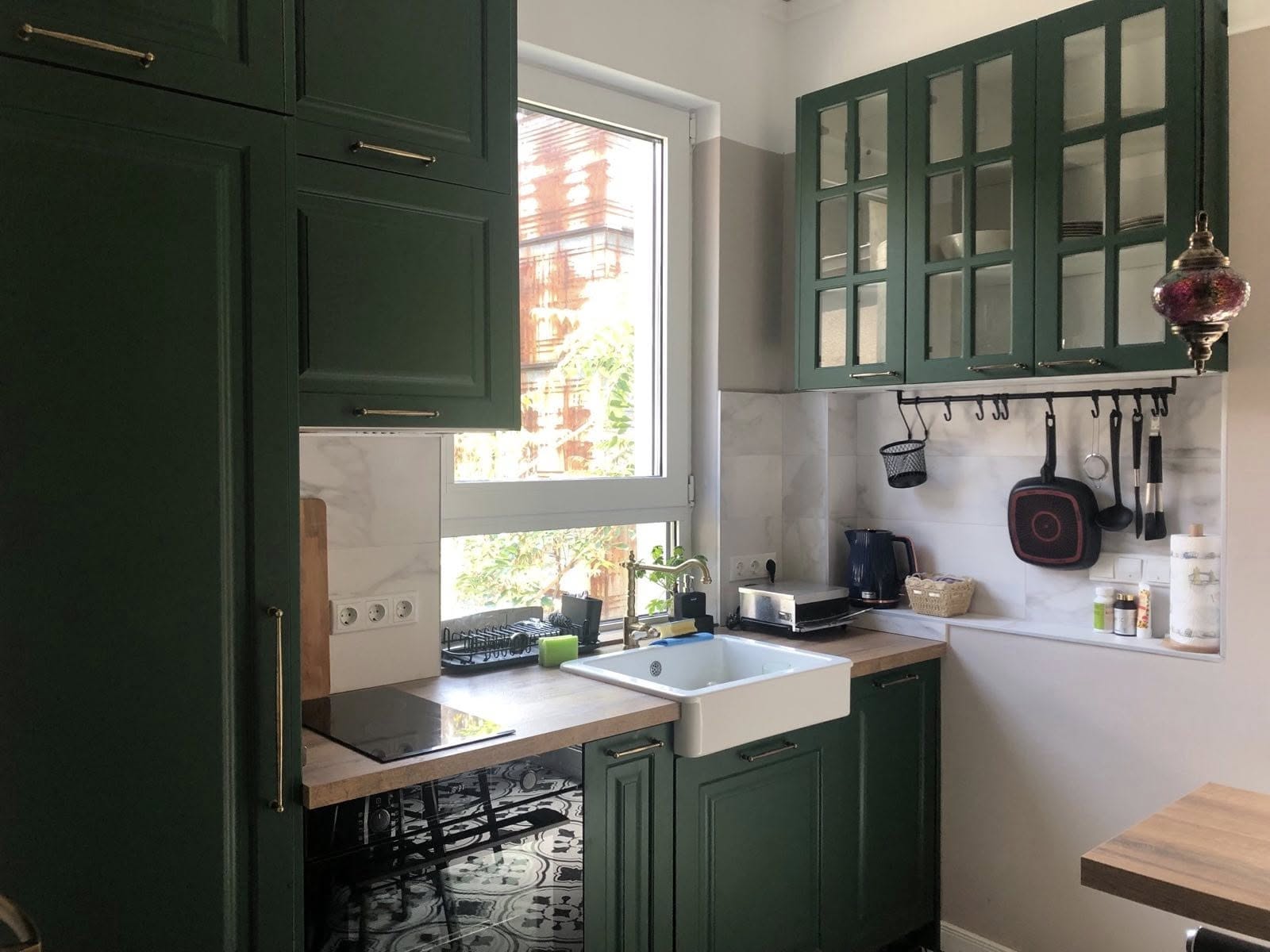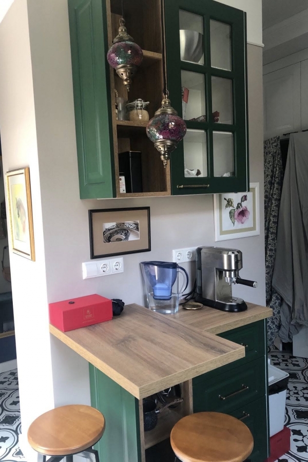 Тази кухня впечатлява със своя стилен и свеж дизайн, съчетаващ класическа визия с модерни удобства. По желание на клиента и след дълго обсъждане избрахме този впечатляващ зелен цвят на шкафовете. Той придава характер и елегантност на пространството, докато дървеният плот внася топлина и естествено усещане за уют.