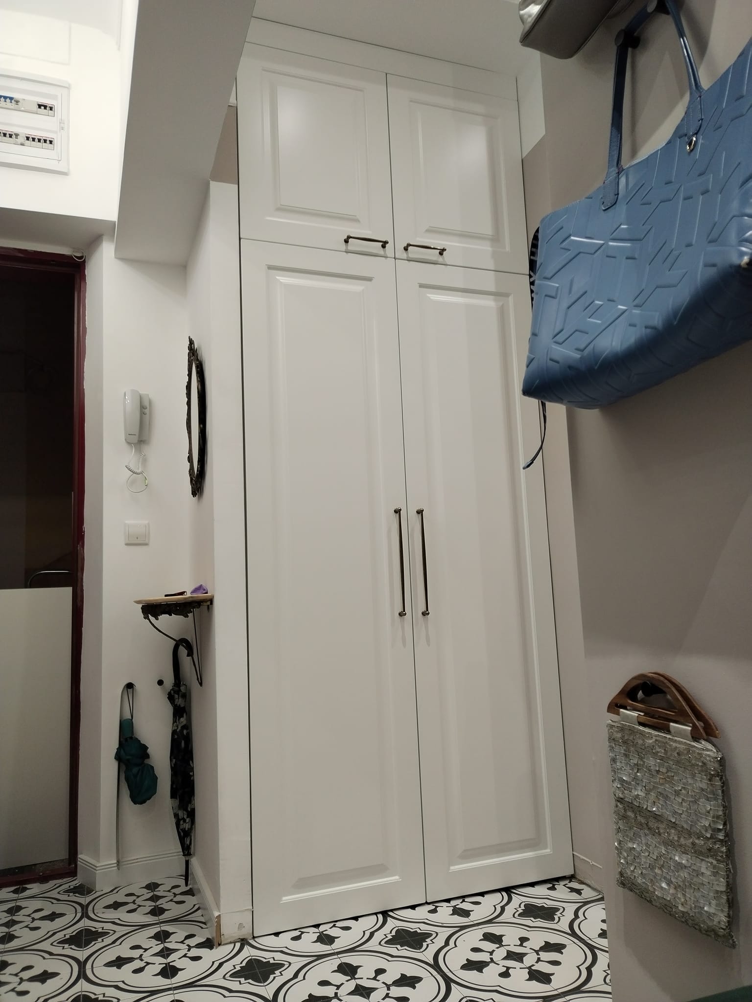 Всичко това се пренася и в дневния тракт , както и в антрето. Умело с използването на тип щокова рамка скрихме пералнята и сушилнята, изцяло интегрирани в интериора.