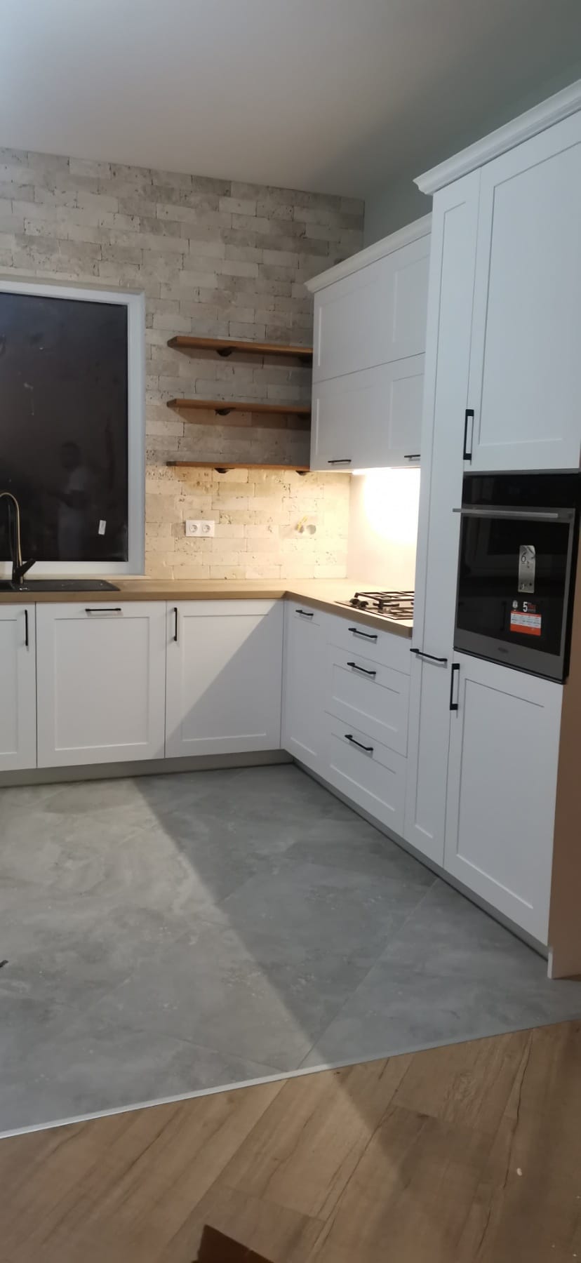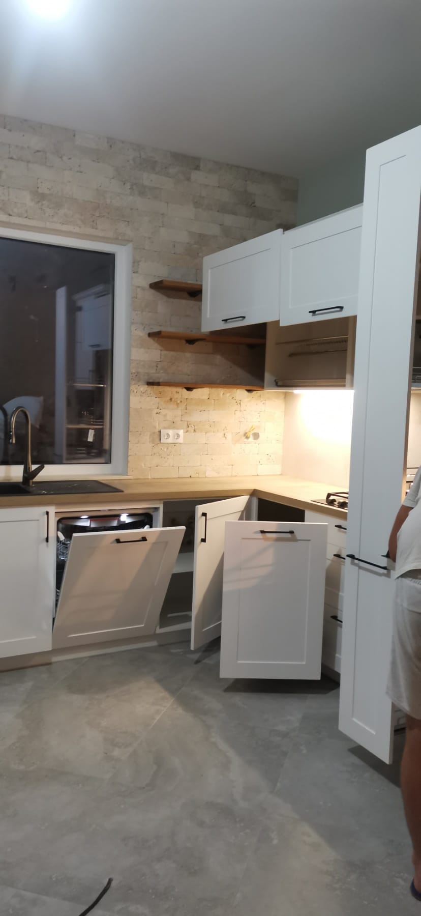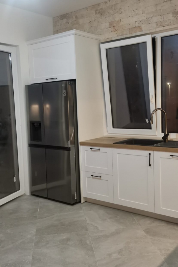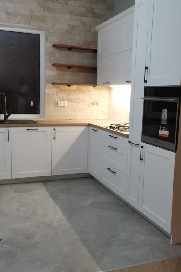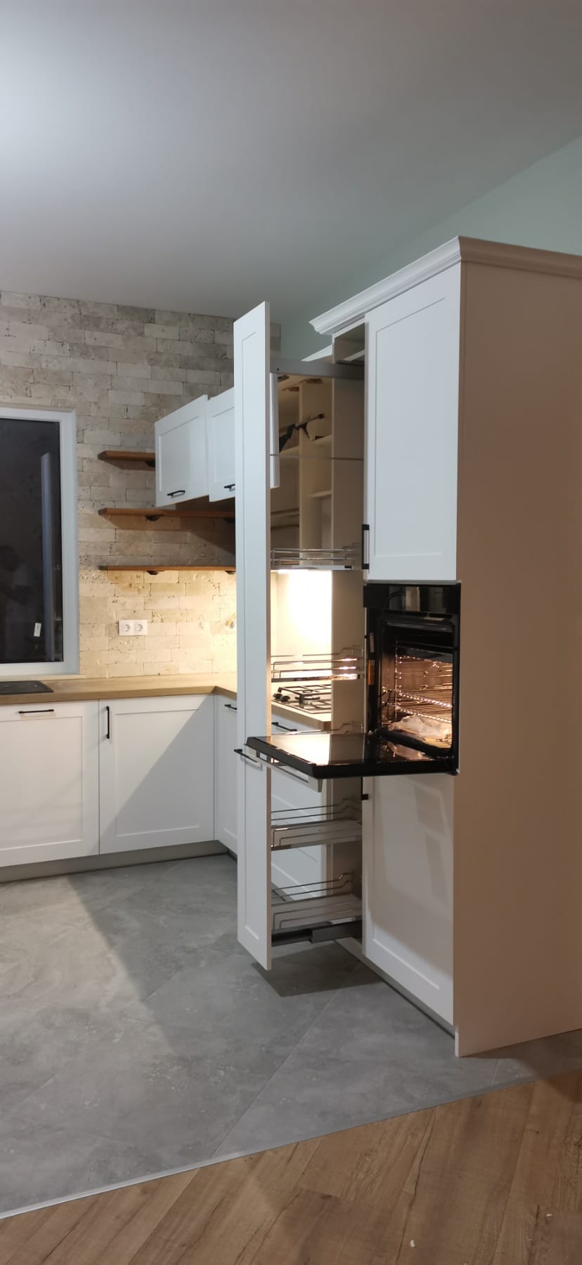 В създаването на тази просторна и уникална кухня се стремяхме да съчетаем модерен дизайн, функционалност и оптимално използване на пространството. Интериорът е решен в светли тонове, които създават усещане за чистота, простор и уют. Горните шкафове са изчистени и компактни, като осигуряват достатъчно място за съхранение, без да натоварват визуално пространството.Декоративните рафтове внася лекота в интериора и същевременно осигуряват допълнителна площ за кухненските принадлежности.