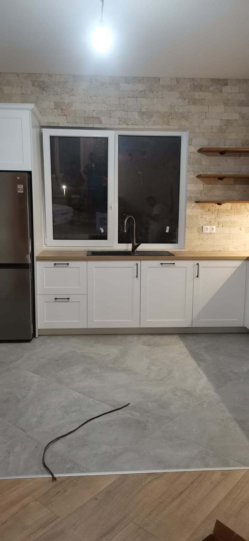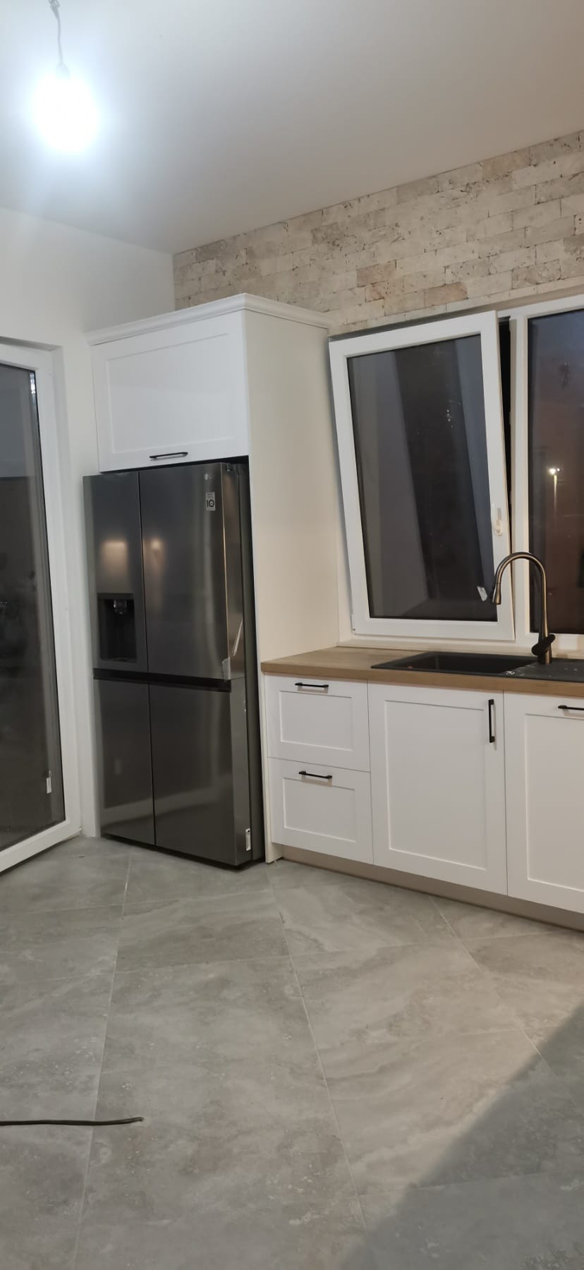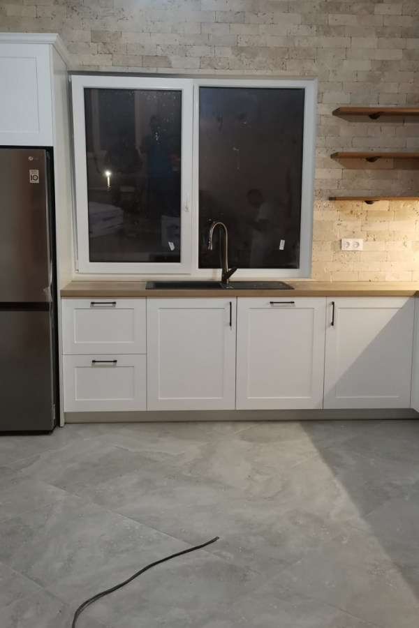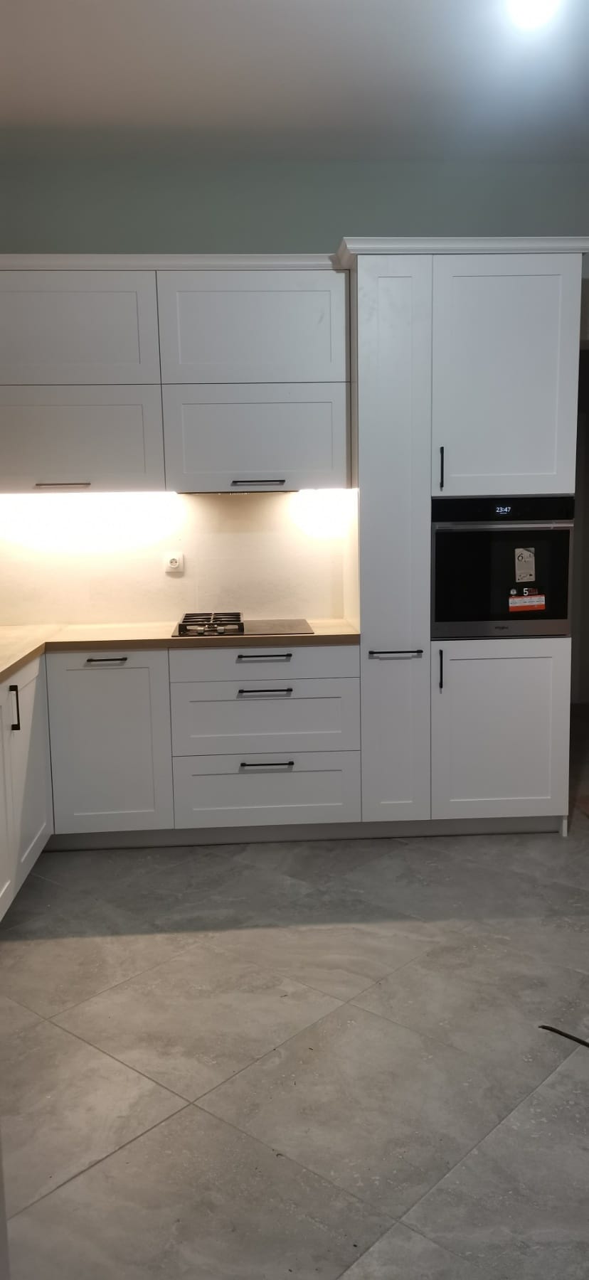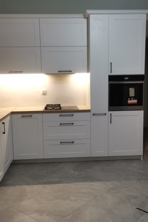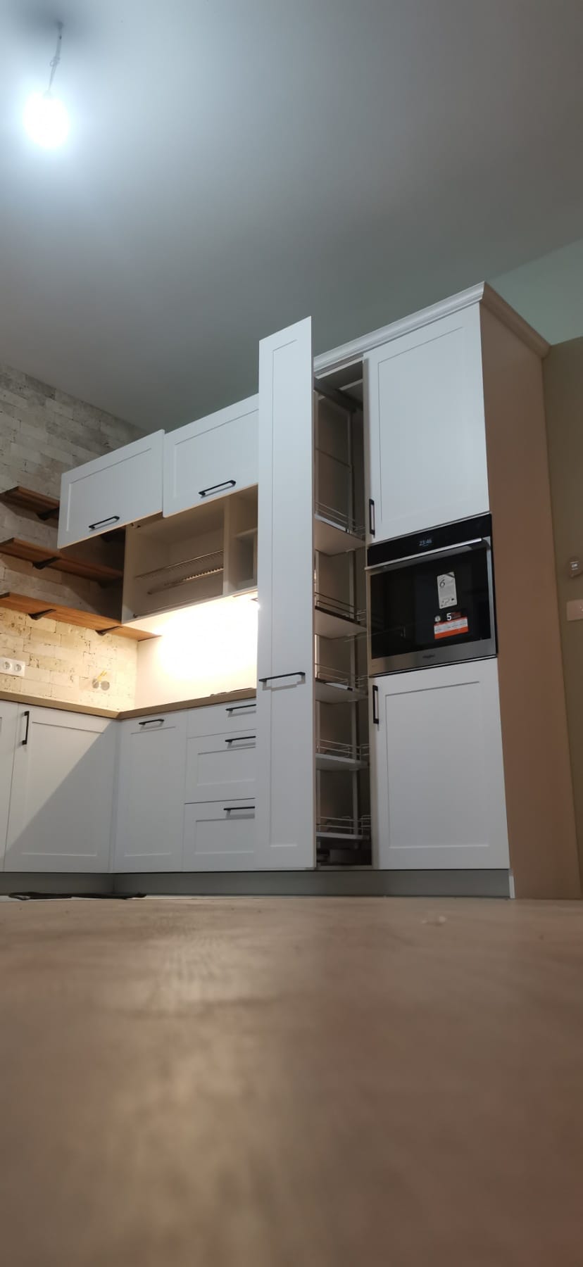В създаването на тази просторна и уникална кухня се стремяхме да съчетаем модерен дизайн, функционалност и оптимално използване на пространството. Интериорът е решен в светли тонове, които създават усещане за чистота, простор и уют. Горните шкафове са изчистени и компактни, като осигуряват достатъчно място за съхранение, без да натоварват визуално пространството.Декоративните рафтове внася лекота в интериора и същевременно осигуряват допълнителна площ за кухненските принадлежности.