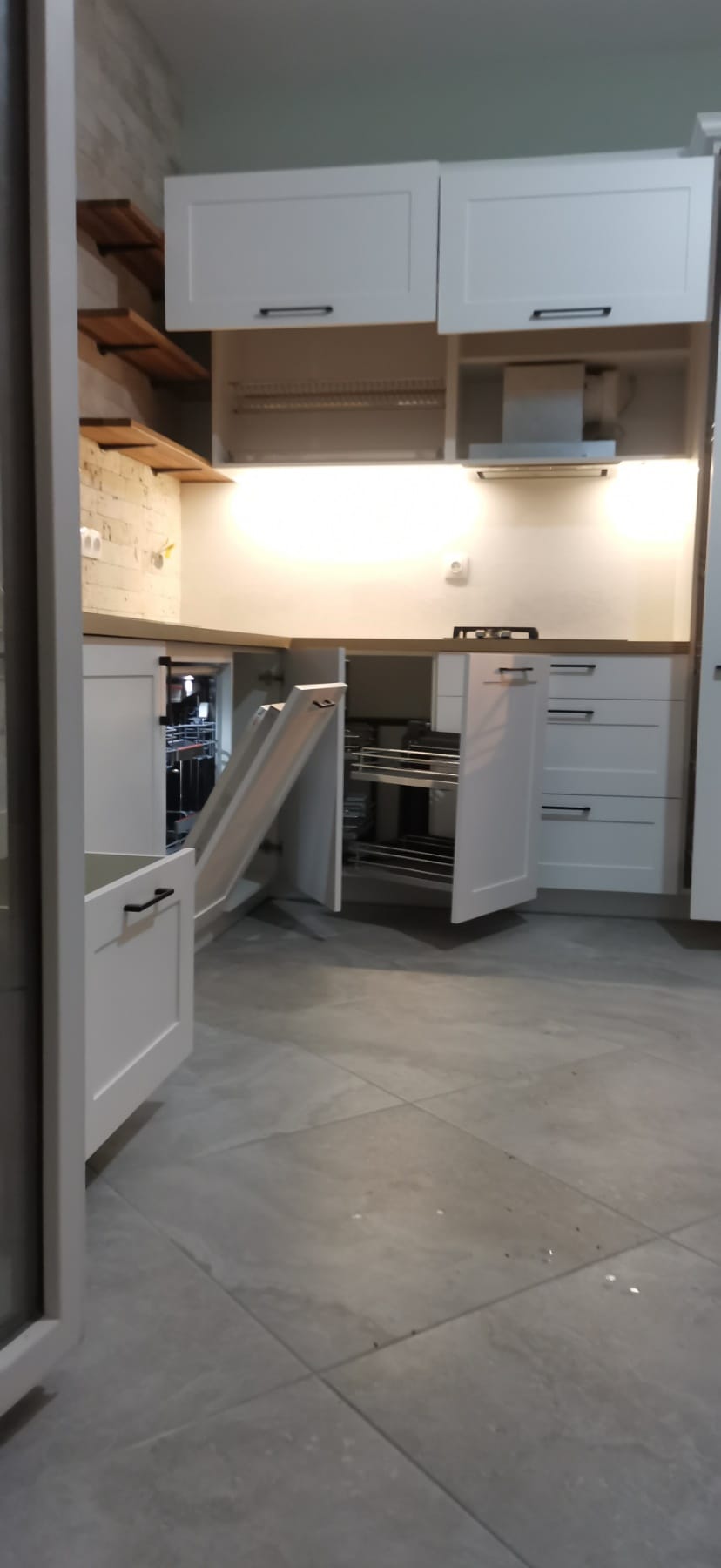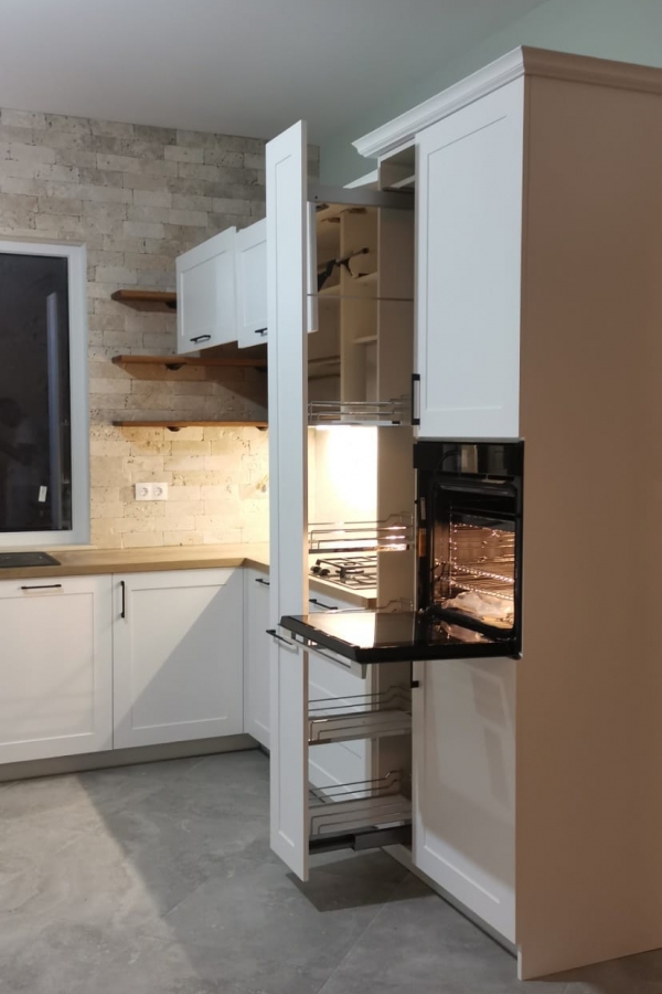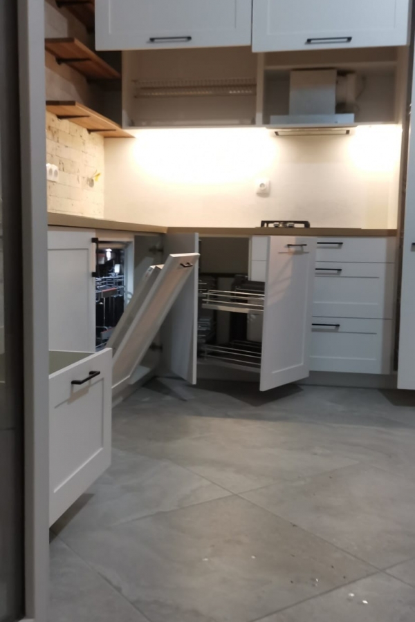 За оптимална функционалност решихме ъгловите шкафове с меджик корнер и изтеглящи се механизми, които позволяват лесен достъп до съдове и кухненски принадлежности, дори в по-труднодостъпните зони. Това значително повишава удобството при работа и ефективността на използване на всеки сантиметър.